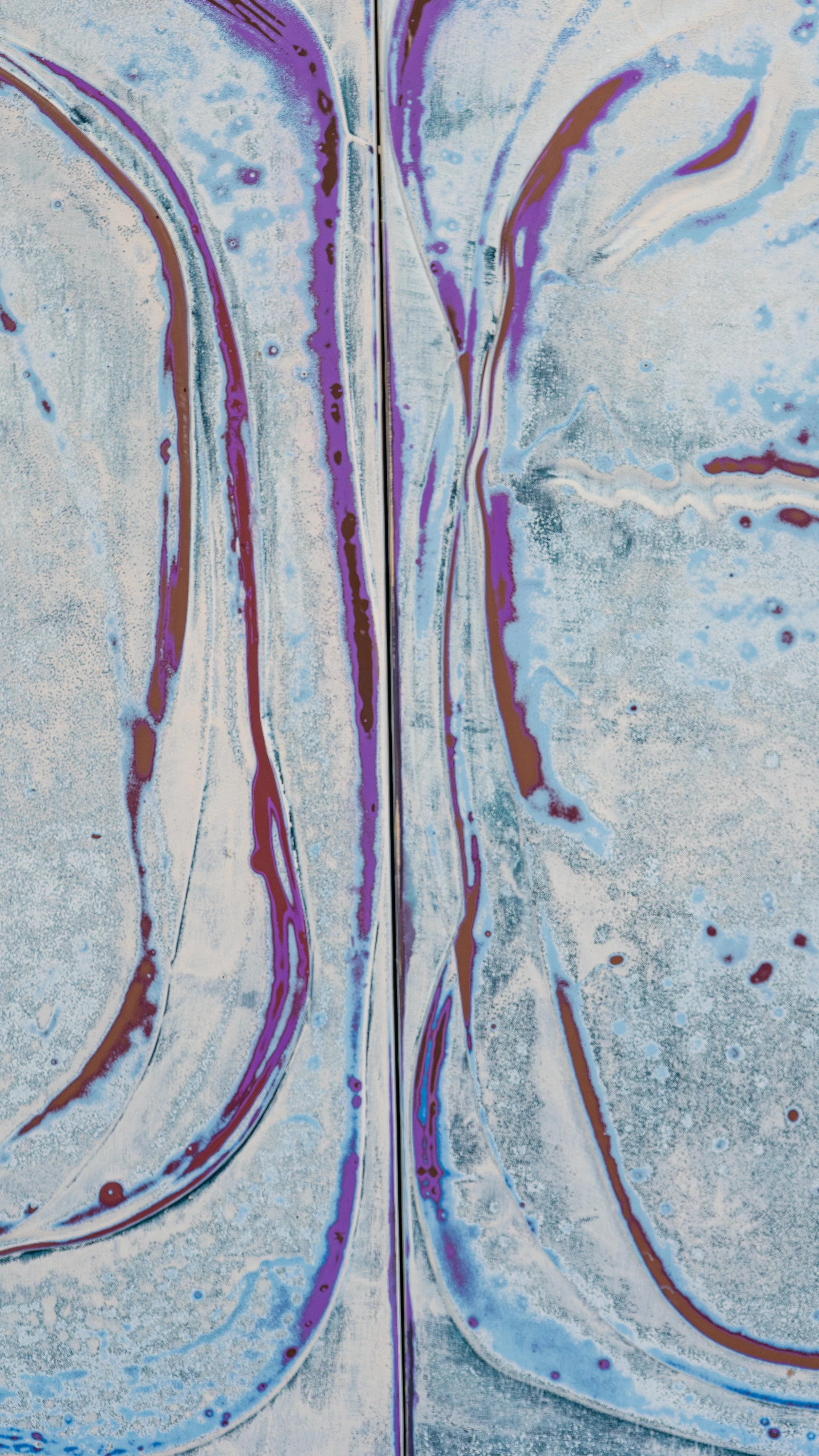 These materials are then combined with a critical component and process-orienting act: the addition of fire, wind, or water using alchemical techniques. What results is a metamorphosis of paint; the creation of rough yet capricious compositions filled with mountainous ranges and geographical forms often harnessed by calm pools of softly rippled and smooth valleys. The uniqueness of Phillips’ process arrests movement and allows paint to visually dazzle viewers in refreshing and visceral ways that feel like new ground is being broken. “